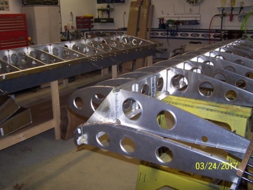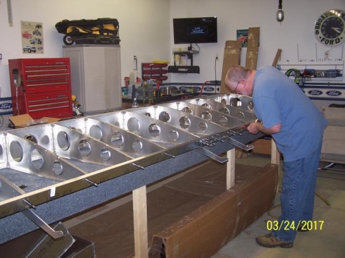Applied Cortec to spar and riveted ribs. Fabricated "L" brackets to fit on longerarm attach brackets. Laid out and dry fit rear spar.