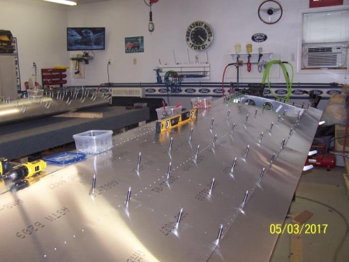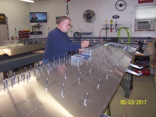 Riveted top skins on left wing. Fitted tail skins, clecoed into place.
