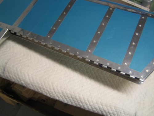 Positioned and riveted the trim tab hinge to the left elevator assembly. The hinge rod was inserted to help prevent the hinge from distorting. Hinge installation was true and straight with no deformation or binding.