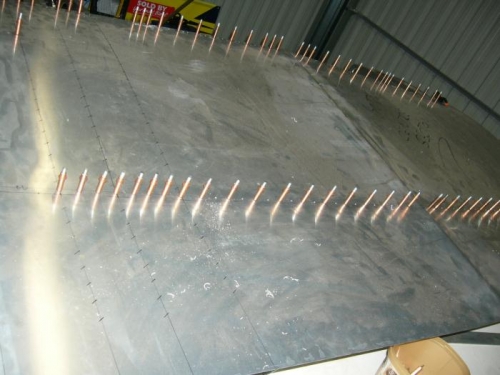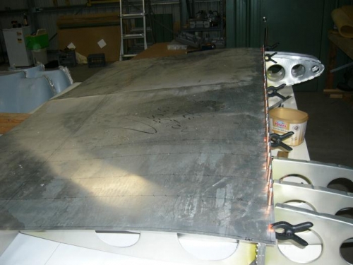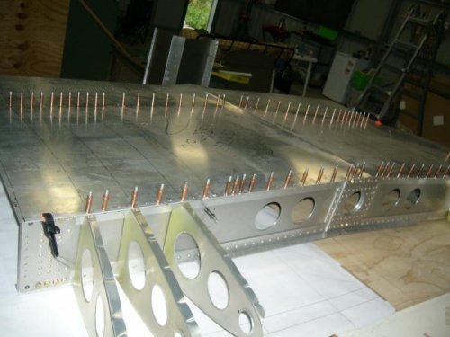 Have put clecos in place where skin is to attach to main and rear spar, next will turn centre section on side so I can drill into ribs