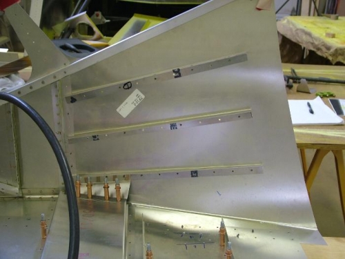 While I worked on getting the brake actuators on the left side rudder pedals, Carole put the "L"s on the fwd fuselage skin between the instrument panel and the firewall. We then started to put all the "L"s in the fwd fuselage. There are quite a few to do and several sessions will be required. Except for a missing AN bolt, all the hardware for the rudder pedals are matched and ready for installation when ready for it.