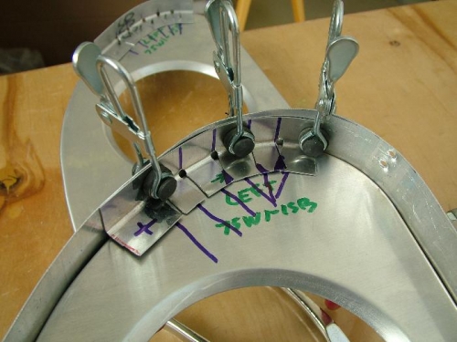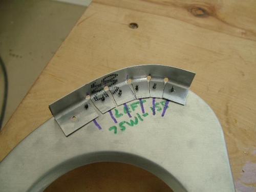 Meanwhile I started on the wings. The first step, following both the photoguide and the purchased DVD, is to put flanges on the leading edge of the forward ribs. The flanges are made of "L" material. Photo 1 shows the stages starting on the right. Slots are cut into the "L" at the designated points. This is filed smooth and curved onto the rib (Image 2), held there by clamps. Note that the predrilled pilot holes in the rib are covered by the metal and not the gaps. Drill through the pilot holes and clico. Later, add the slat connection piece between the two pieces and drill for A4 rivets, deburr, treat and river.
