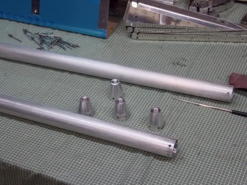 Drill/painted short aileron pushrods. Fit and drilled end fittings on long aluminum aileron push rods.
