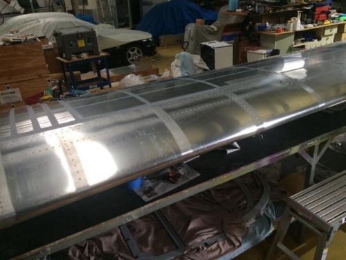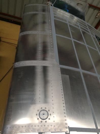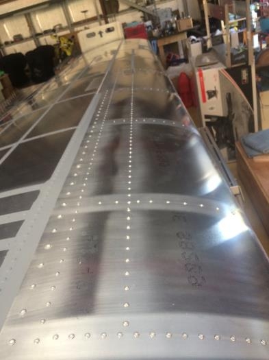 Degreased and filled rivets on top skin of left wing fuel tank.