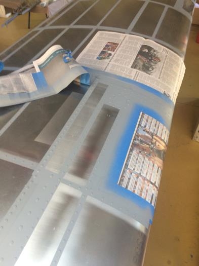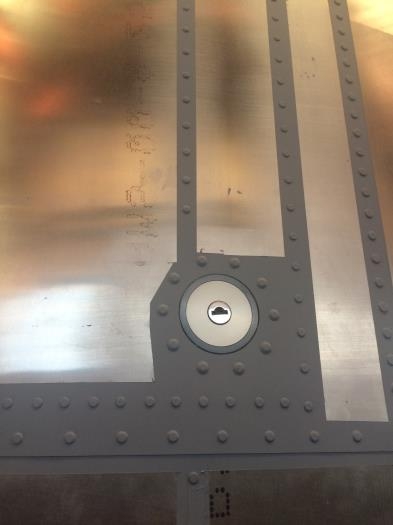 Fill remaining rivets on left wing tank upper skin, Dremel same, mask area and prime.