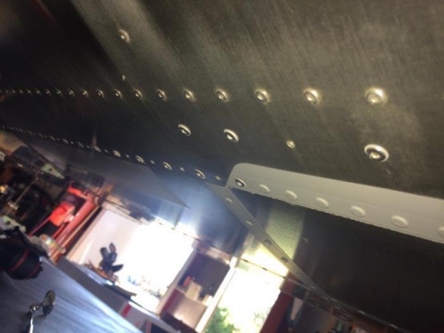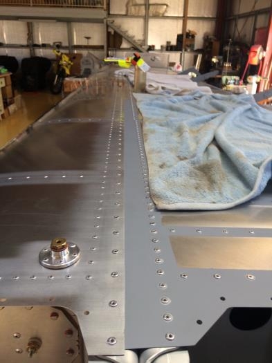 Left wing tank attachment and rivet filling.