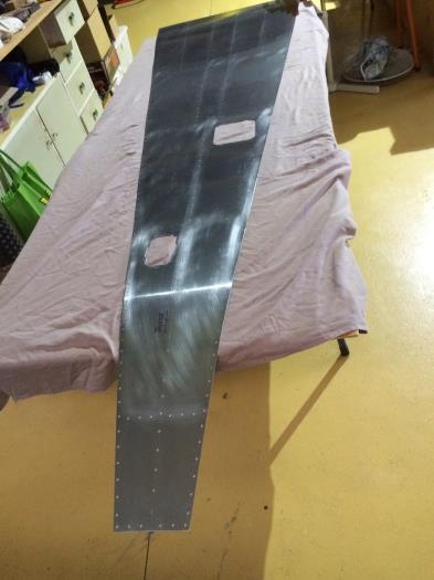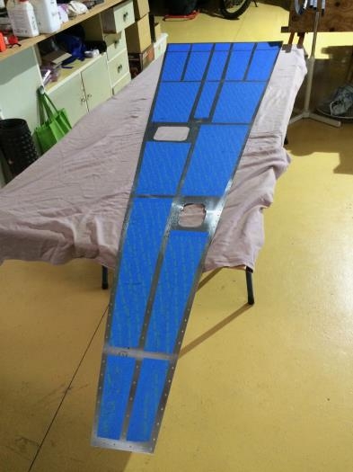 Rear fuselage belly skin deburred, masked and prepared for primer.
