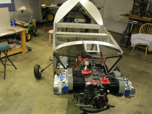 Rick and Nancy Sheldrake are visiting from Wasaga Beach, Ontario. Rick has a lot of knowledge and skills about anything electrical or mechanical and I wish we could have had more time together. At least we were able to get the engine attached to the engine mount. We removed the CHT wires and the baffle. Rick and I lifted it into position and Konnie and Nancy installed the bolts, bushings, washers and nuts. It feels good to finally get it onto the airframe.
