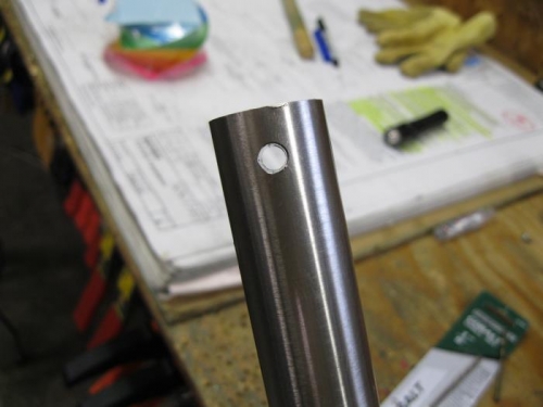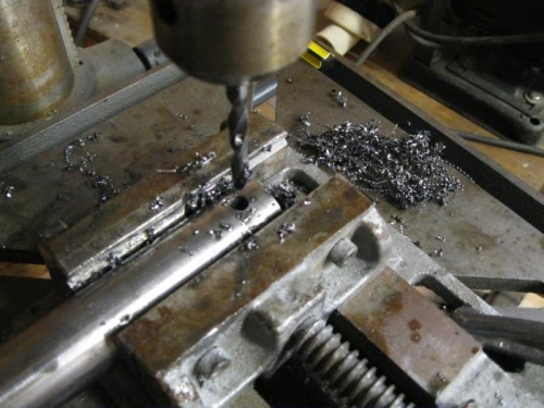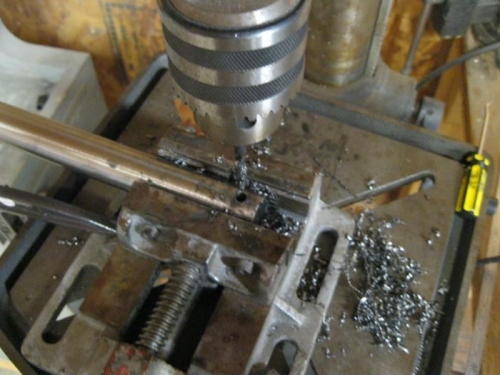 I used a 1/8 inch carbide drill bit to drill from the back side to the broken 1/8 inch bit and then punch it out. I went back and updrilled the original hole to 1/4 inch for a perfect hole.