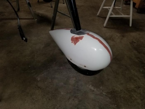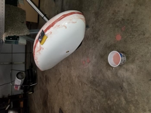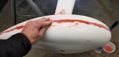 I applied glazing compound to smooth out the seams of the wheel pant halves. Allow to dry and wet sand.