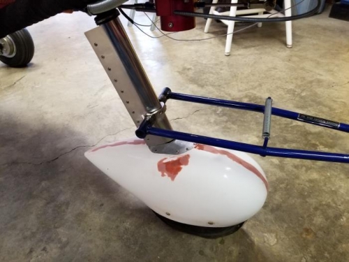 Today I installed a mount for a tow bar on the nose gear.The mount is a stainless steal Split collar with pins welded to each side. My friend Jeff Logan set it up on his plane and also made one for me. He also welded uo the end of my tow bar to fit the split collar pins. It works really well. In the pictures I do not have the pin to the gear leg fairing installed.