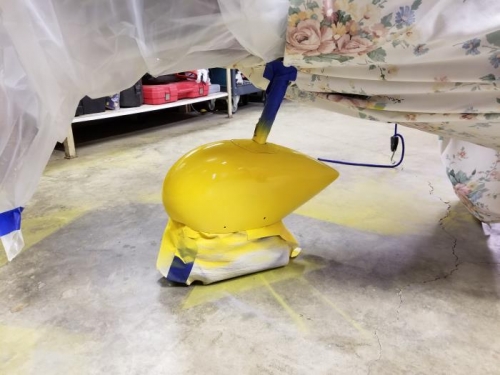 I painted the nose wheel pant. Yes I should have painted it before installing. However it seemed to work out ok. I covered everything with plastic and used a lot of masking tape. Sanded, cleaned primed, sanded again. 2 coats of color and 2 coats of clear. I also did some work on the strut fairing and then polished it. I am pretty happy with the result.