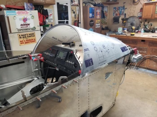 Initial cut and final finish of the windscreen. Partially installed with clecoes into the windscreen bow and upper firewall. We also set the Canopy frame in place.