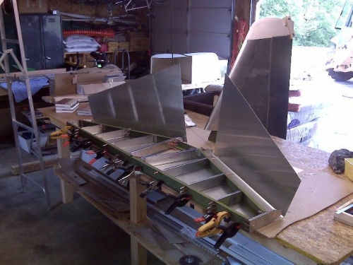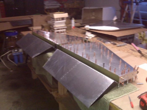 Drill #40 pilot holes into the rib flanges using the skin pilot holes as a guide and then clecoed the skin to the Ribs.Fit pilot drilled Elevator Hindge and attached to the Horizontal Stab to test fit.