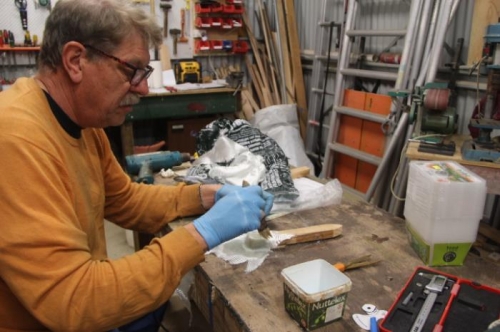 Arranged some taped bits of amusingly shaped wood and applied 12 x BID over them to form the actuator bracket, based on Wayne Hicks and Drew Chaplin's design, adapted for my single tab fitting.