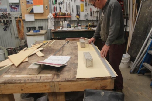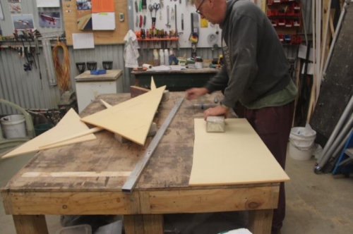 Cut out port lower skin foam using the outline I marked out on the table for the starboard side, and started making sense of putting the bits together.