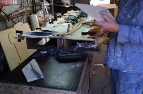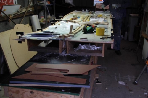 Trimmed channel and tapes. Pretty crappy job. The bottom of the channel took up wrinkles from the plastic and micro leaked everywhere. If I did it again I would shape the foam rather than use micro for a bottom fillet, use box tape instead of plastic and bondo the foam to the table.