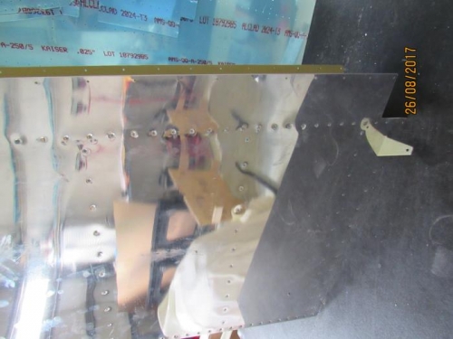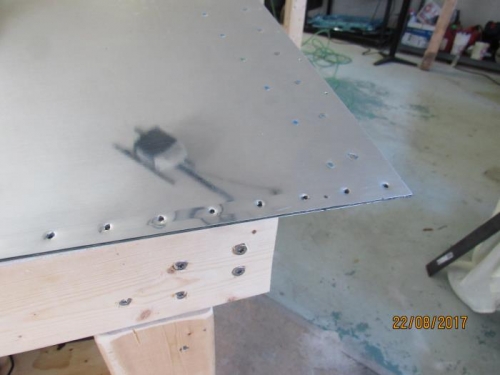 7-10 step 5 complete, noted some oilcanning. Finished the trailing edge and rest of the rudder riveting except where the counterweight goes