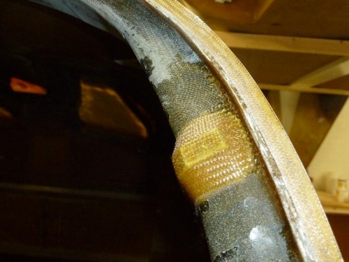 The manual calls for one bid for this job but I used 2. The first one coved the area and 1” over the sides the second one was 2” over the sides and then used peel – ply to blend in. I just need to tap the holes now for the ball to fit.