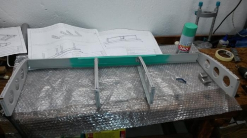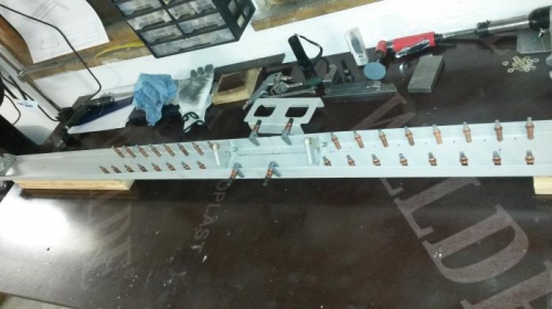 1. Jig assembly UJ-320 set up for Horizontal Stabilizer Pre-assembly performed. 2. Folowing the DWG 355M and instruction for assembly of the Horizontal Stabilizer, internal structural components joined and drilled through the pilot holes for initial pre- assembly of the Horizontal Stabilizer. 3. All holes in the structural parts drilled to final diameter and deburred as per the drawing 355M