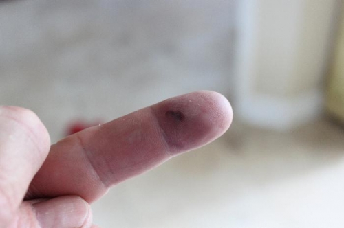 Blood blisters from pinching myself with the cleco pliers and a cleco clamp that I was trying to take off. Cleco pliers slipped off the end and somehow pinched my finger in the clamp spring. Oh well. And I just today had my wife remove an aluminum sliver from the exact finger at the first joint just below where the blister happened. Go figure..