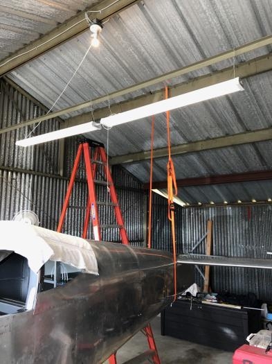 I borrowed a couple doorway ramps designed for motorized wheelchairs and rolled the fuselage up onto 2x4 risers. Then I let half the air out of the nose gear tire and that combo brought the fuselage into almost perfect horizontal position. The tail just needed a slight rise that could be held in place so I can proceed to permanently mount the vertical stabilizer. I used a ratcheting tie down strap threaded through the ceiling beam and taped to a lifting point under the fuselage. Slightly ratcheted the tail up, measuring for level several times. I found the sweet spot and that combination held the plane firmly in place while I test fitted the vertical stabilizer.
