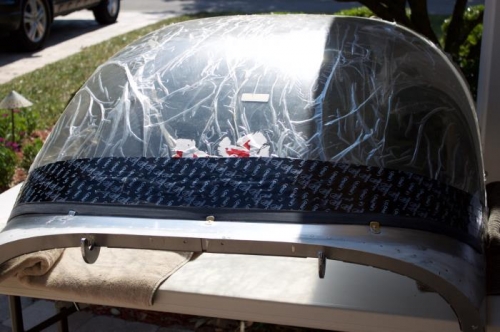 Back at it again. I waited for special 20mil PVC tape from Home Depot online. We don't stock this pipe insulating tape in Florida. The inside canopy forward edge was previously painted black one inch high across the front. That hides any fiberglass work. I taped the ultimate finish line with the PVC tape and added couple of layers above that for security (mental and physical). Used 50 grit abrasive and rough sanded the canopy outside forward edges as well as the aluminum deck for about 2 inches in frront of the canopy. There are three clips securing the forward edge of canopy to the deck. Probably could have got by with one but three is the number. Those were sanded as well to minimize the step up effect. All will be covered by fiberglass in the end. Next step is mix up epoxy with flox to peanut butter consistency and fill the gap in front of canopy so that the canopy plus fiberglass flows in a straight line to the canopy deck metal.
