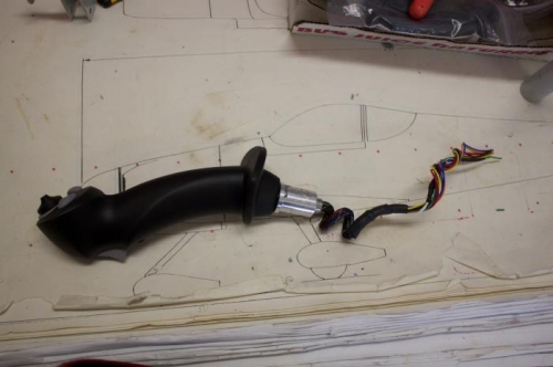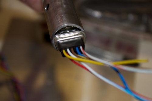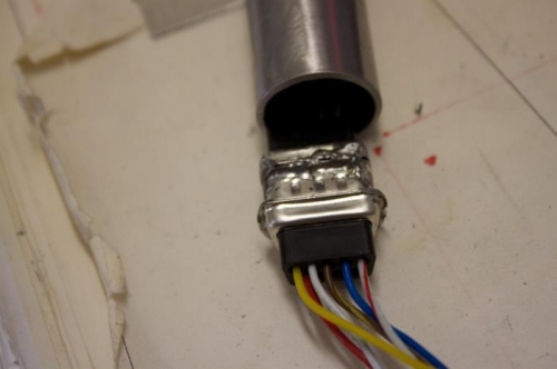 You can see in picture 1 how the female DB9 will stop at the end of the removable stick. When installed, this DB9 is actually buried down in the base and expoxied in place. Here, I'm just fitting it. 2nd picture shows the 2 DB9 halves pushed together and I am getting ready to epoxy the male DB9 into the stick. A little blue tape on the female DB9 keeps it from getting epoxied together by mistake. I coiled the stick wires to give me some surplus in case I need to pull some out. Later on I realized you wouldn't do that, so I shortened the wiring up enough to allow installing the DB9 pins and then pushing it up into stick tube. Because there is a stop button also inside, you want to shrink wrap the wires for about 4 inches past that snap lock. I did that after these pictures..