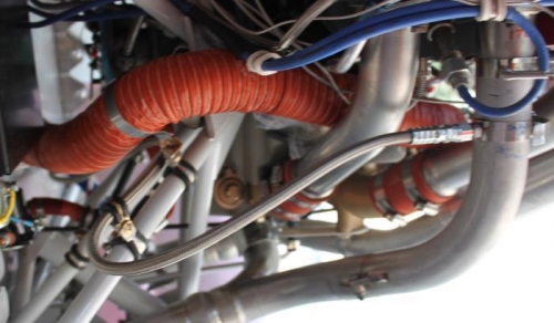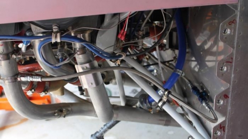 Connected oil lines to the injectors and tightened all fittings. Secured lines with adel clamps to the engine mount tubes. There is nice room for engine vibration and movement without stressing the connections. #4 exhaust pipe has a heat deflector installed to keep the nearby oil line cooler.