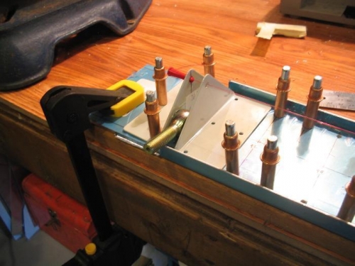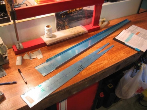 Rear spar of the vertical stabilizer mated with reinforcement plate, rivet pattern laid out and drilled. Hinges located and drilled. Cut lower end shape into reinforcement plate.
