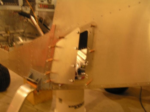 Rivet baggage door and fit and cut fuel filter access door to lower left side of fuselage.