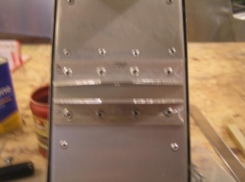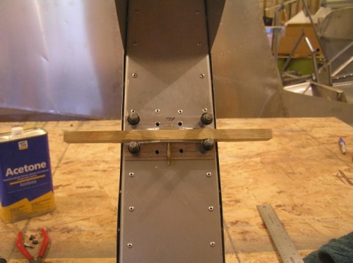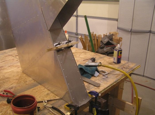 Cut out and drill two 7R2-4 rudder hinge angles. Measure and position to rudder. Drill, cleco, remove and deburr and priem. Re-cleco and rivet.