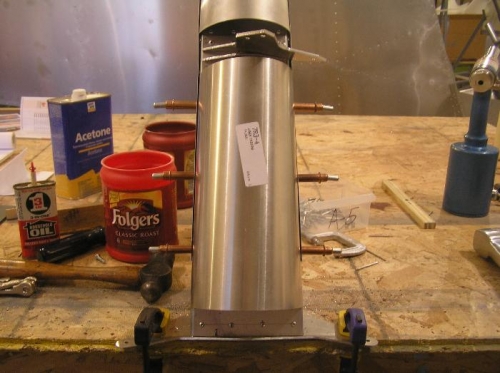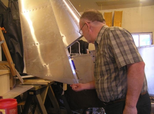 Fit rudder to fuselagfe with 3 washers on top and one washer on the bottom. Fits up very well. Both hinge points are set so now we can drill in place the 7R3-4 lower spar faring, and set the upp spar fairing in place but will not drill until the Horizontal Stabilizer is set in place for clearance.