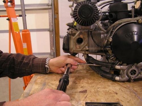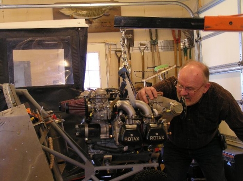 Round off the ends of the E2-1X brackets per plans. Drill E1-1X brackets to 10mm holes and attach to engine and safety wire. Set and level engine and mark location of holes for AN4-10 bolts, drill and trim.Remove E1-1X brackets and prime. Assemble brackets and torque to 220 in/lbs. Set engine in place and secure with AN4 bolts torqued to 70 in/lbs.