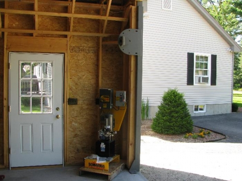 Worked on hanger door installation. Erected both side legs. Trimmed sheathing and verified door fit.
