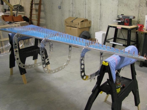 Step 7: Placed Bottom Skins upside down onto 38" high saw horses. Had modify my composite horses with wooden legs made from strapping that I had laying around. Step 8 and 9: Hooked and clecoed the Frames to the J-Stiffeners of the Left and Right Bottom Skins. Did not have to bend or enlarge J-Stiffeners.