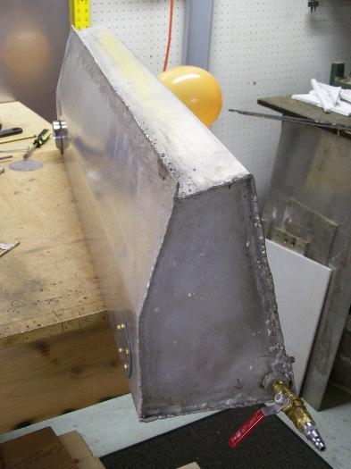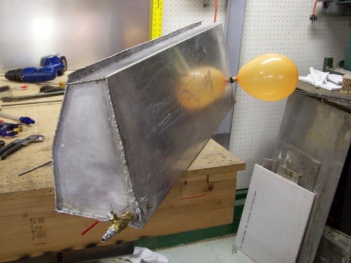 Figured I'd do a leak test on the tank. Went to Home Depot and bought some fittings and a 3/8 inch gas valve. Made a fuel gauge sender cap and cut out some rubber gaskets. Hooked everything up, rubber banded on a balloon to the vent fitting and slowly pressurized it. Only leak I'm seeing, even with soapy water, is around an area I wanted to reweld anyway, a small 4mm length that obviously got missed near the far corner. Even so, the tank held good for about 10 minutes before the balloon sagged. I'll clean up that weld next weekend.