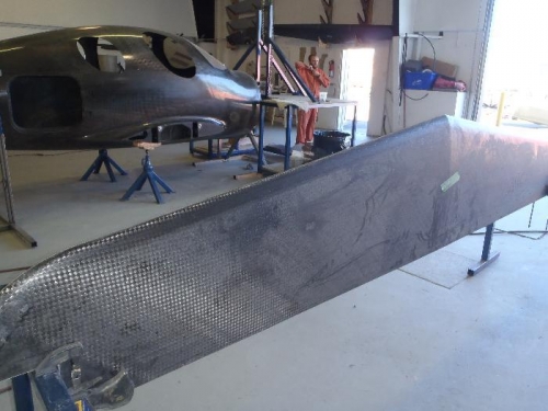 Sanded off hysol squeeze out from bonding horizontal together yesterday. Filled small voids with jeffco resin mixed with micro balloons. 2 ply leading edge lay up coming soon.