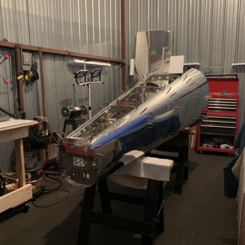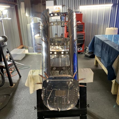 The rear bulkhead was then installed into the tailcone. Trim servo wires and strings to pull through stabilator and rudder cables were routed and side panels riveted in place.