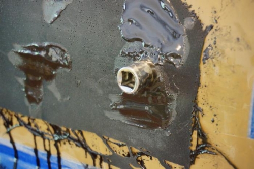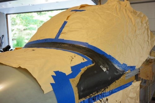 Glassed center section of canopy fairing. Found canopy pivot bolts, drilled out surrounding fiberglass, inserted waxed drive and epoxied to achieve correctly sized round hole.