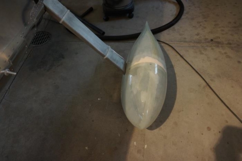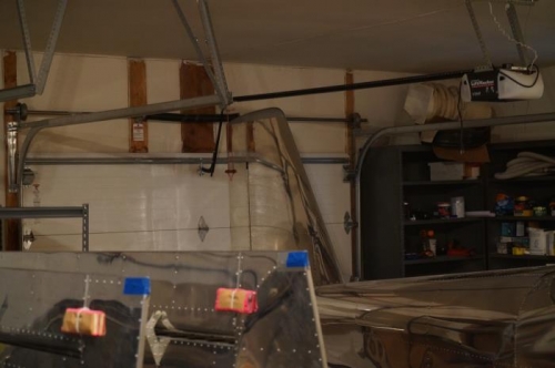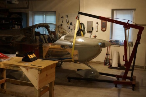 Sanded and reinstalled wheel fairings. Tail is too tall to clear garage door. To lower tail, the nose will be raised with the engine hoist. Straps were positioned and a "trial run" lifting the nose attempted. All appears a "go" for the move to the airport. Remainder of the day spent packing for the move.