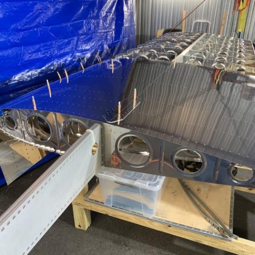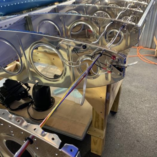 Completed installation of the stall warner switch. Ran wiring for stall warner, landing light and position lights. Mounted electrical connector on base rib. Initial fitting of inboard lower wing skin and wing skin doubler. Will need to reroute AOA tubing so wing attachment is at the top (not bottom) of the rib.