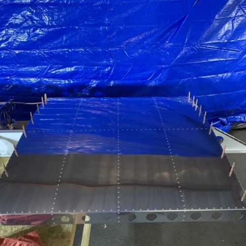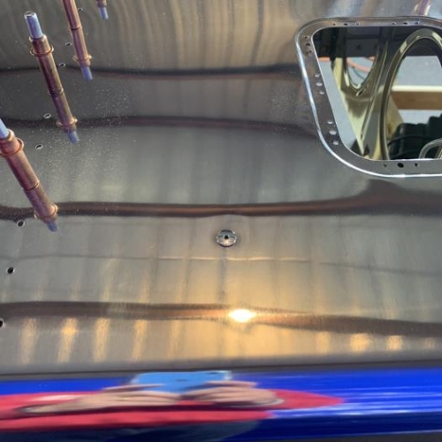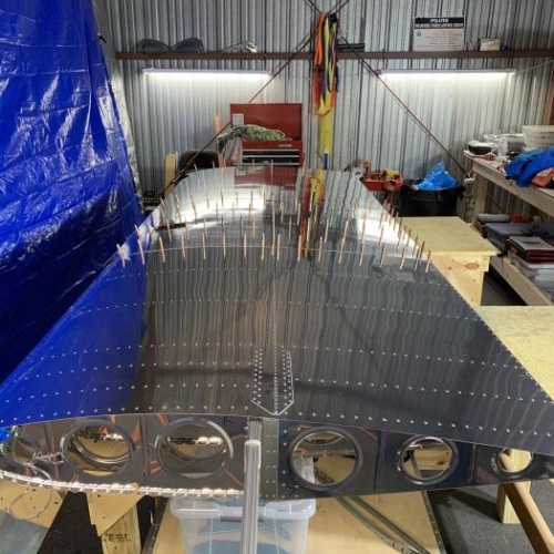 Completed outboard lower wing skin riveting and fitting of middle lower skin. Adjusted stall warner to fit slot in skin. Added AOA port (a rivet with the mandrel tapped out).