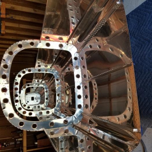 Finished riveting lower left and right skins to bottom left and right skins and to the tailcone frames. Cleco'd left and right side skin in place as well as F-1211 assembly to the rear.