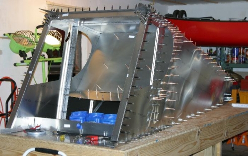 Finished fitting baggage compartment back and bottom skins to aft fuselage. Began drilling out all holes to final size in preparation for disassembly and deburring.