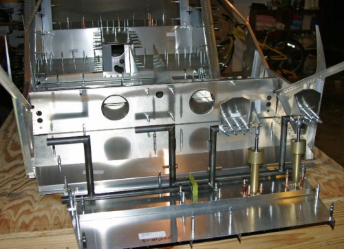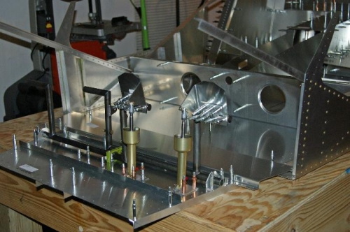 Continued work on the forward fuselage. Finished fitting brake cylinders to cabin floor. Fitted and clecoed several parts including the lower cabin side skin assemblies to the cabin floor.