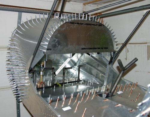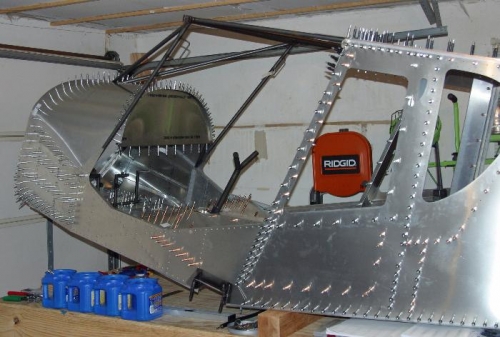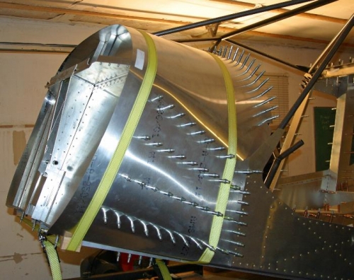 Fitted, installed and clecoed in place the instrument panel and forward fuselage skin above the instrument panel. Cargo straps were used to hold the skins tight against the firewall during this process. Total construction time now at 184 hours.