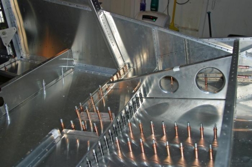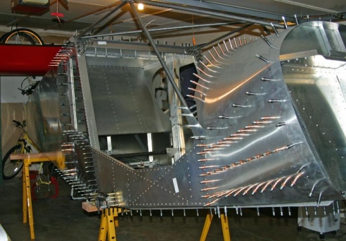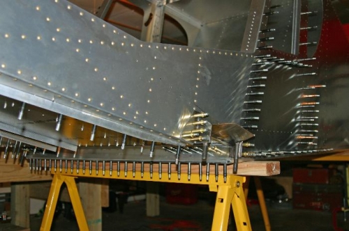 Riveted the rear baggage compartment to the fuselage. Moved the fuselage from the work table to the saw horses in preparation for gear installation. Continued drilling holes in the bottom skin, instrument panel and firewall to final size.