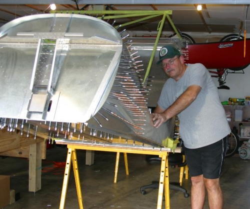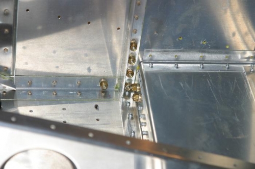 Began riveting the aft and forward fuselage together. The main gear / wing strut fittings were primed and bolted in place.