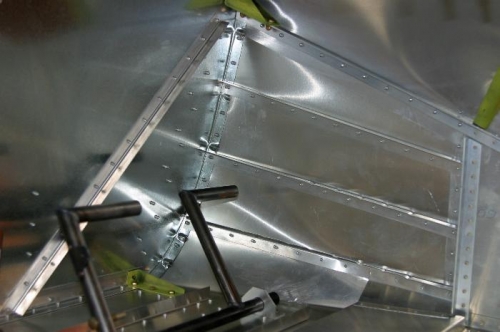 Continued riveting the forward fuselage. Firewall and forward skins were riveted in place. Began notching the main landing gear to fit between the gear fitting studs. Total construction time now at 231 hours.